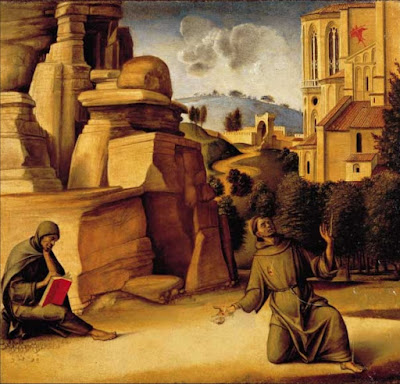 提到聖傷,這不期然會令賞畫者想起聖方濟各,也就是這幅祭台畫所在的聖堂的主保聖人。在祭台畫的主畫〈貞女加冕〉中,他站在御座的右邊。至於他得到聖傷的一幕,也繪在主畫下的五幅小底畫(predella)中最右手邊的那幅: